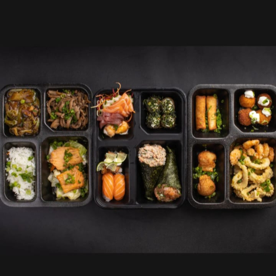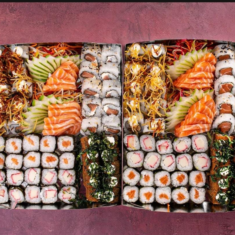 6 Sashimi 2 Jhous 2 niguiri skin 2 Niguiri salmão 4 Hot Hol 2 Temaki 100g a escolha do cliente 2 Guioza 2 Harumaki De Queijo 2 Salmões Grelhados com legumes 1 Shimeji 100g