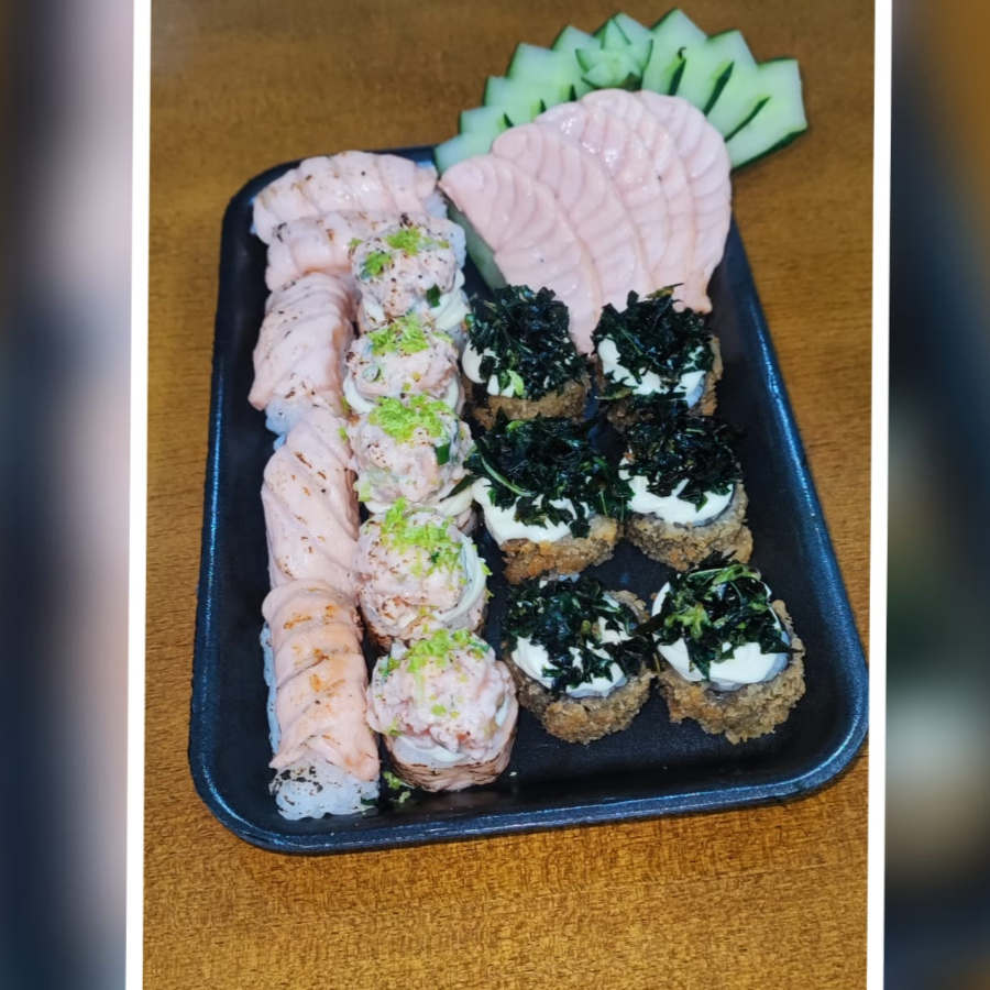 Combo composto por 5 hot holl + 5 jhou maçaricado +5 niguiri maçaricado + 5 sashimis maçaricado, itens não alterável.