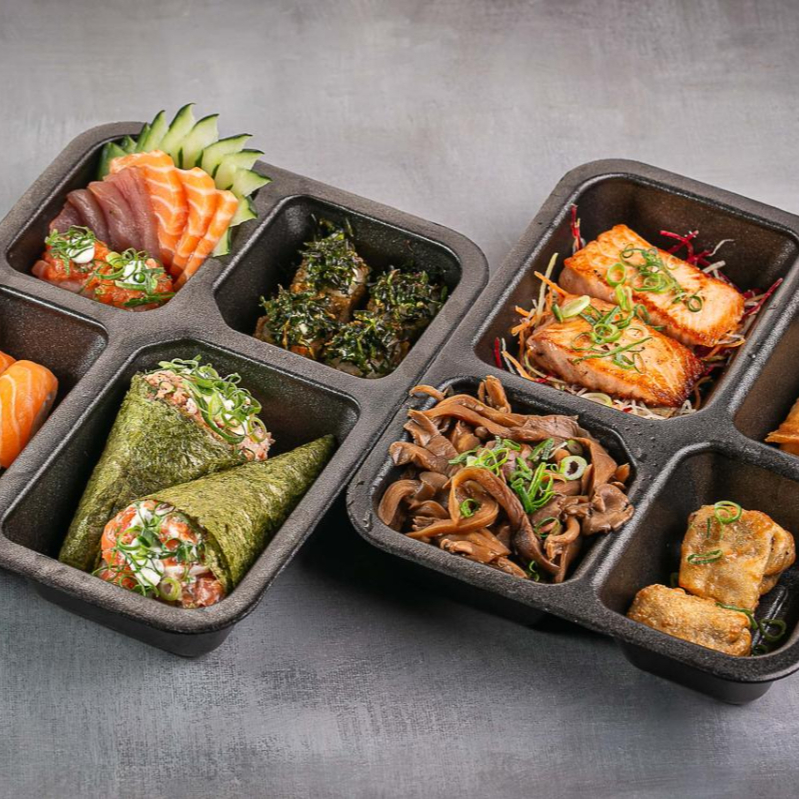6 Sashimi 2 Jhous 2 niguiri skin 2 Niguiri salmão 4 Hot Hol 2 Temaki 100g a escolha do cliente 2 Guioza 2 Harumaki De Queijo 2 Salmões Grelhados com legumes 1 Shimeji 100g