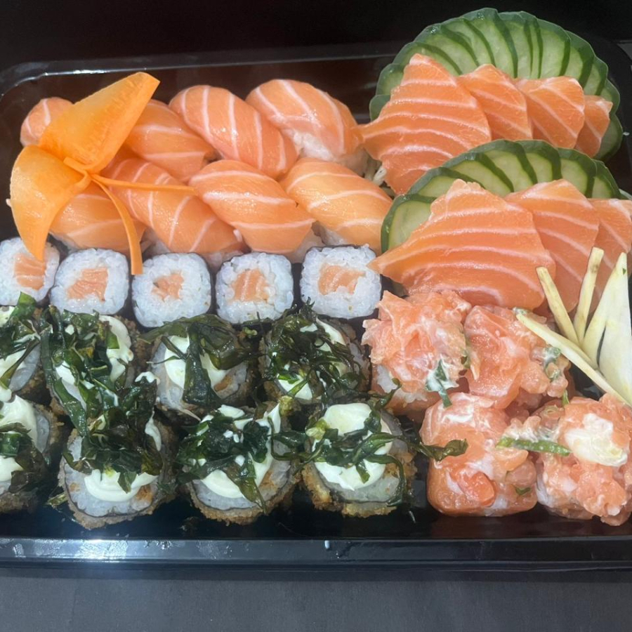 8 Sashimi, 4 niguiri, 4 jhous, 4 uramaki, 4 hossomaki, 8 hot holl, 4 hot doce, 2 temaki, 2 shimeji, 2 yakisoba, 4 salmão grelhado, 4 harumaki, 4 guiosa, 2 lula empanada , 4 2chocket de salmão. (Não Fazemos Alterações Nesse Prato )
