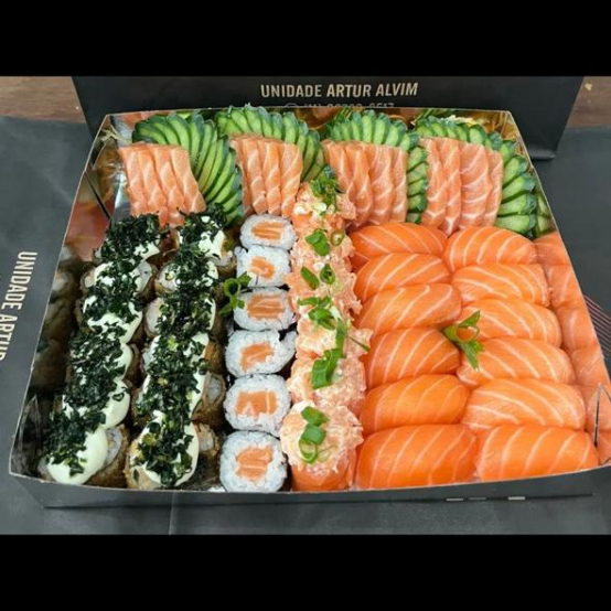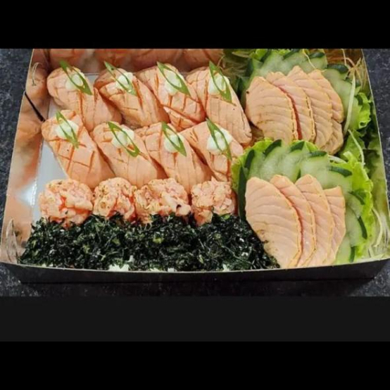 12 sashimis 4 harumaki de queijo 4 guioza 4 salmao grelado 2 shimeji 4 niguiri de salmao 4 niguiri skim 4 joy de salmao 4 temakis de salmao