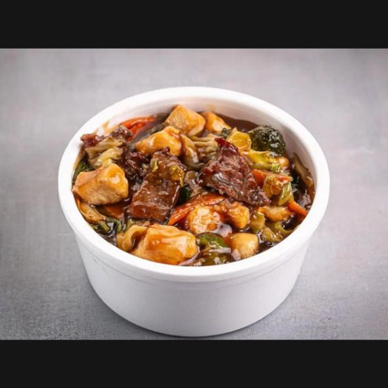 Macarrão, carne bovina, frango,champignon, frutos do mar e legumes.
