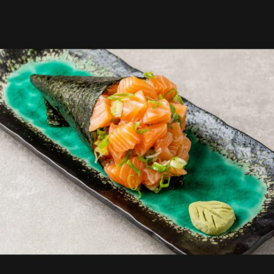 "Combo temaki 3 temaki de salmão grelhado"" acompanha 4 molho 2 hashi ."