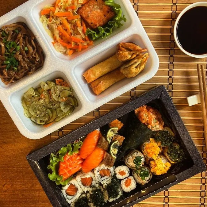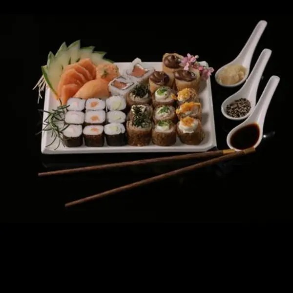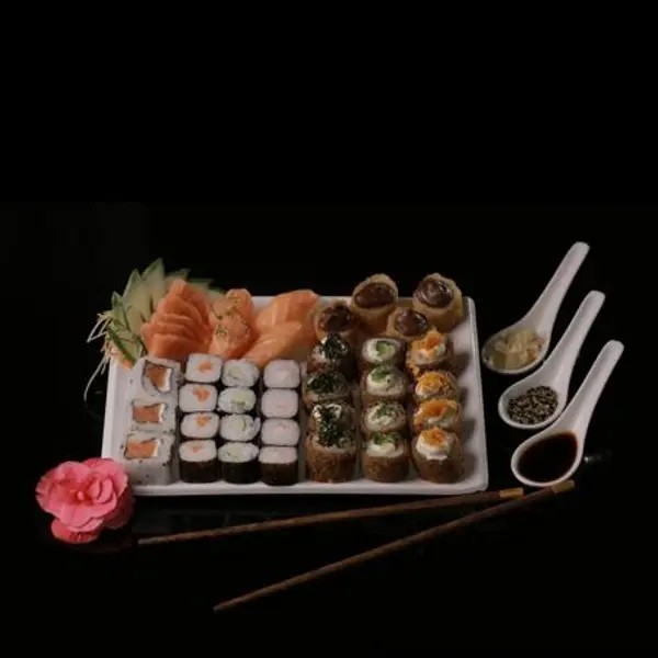 2 Temaki, Shimeji, Salmão grelhado com legumes, Harumaki, Guioza, 42 Unidades de sushis variados