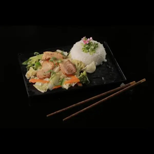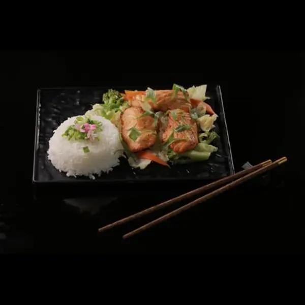 Salmão grelhado, com legumes refolgado acompanhado com gohan