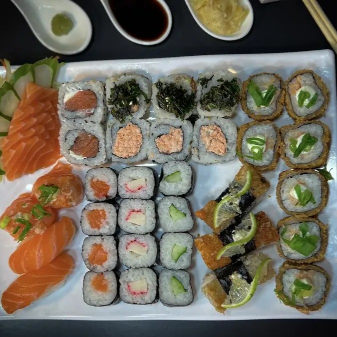 5 Sashimi de tilápia 5 Sashimi de salmão 3 Niguiri maçaricado 3 Niguiri skin 3 Jhou maçaricado 3 Uramaki Skin 3 Uramaki de salmão 3 Kanimaki 3 Salmomaki 3 Kapamaki 5 Hot-Couve 5 Hot-Roll