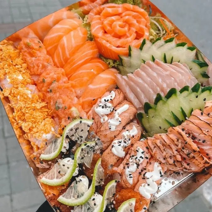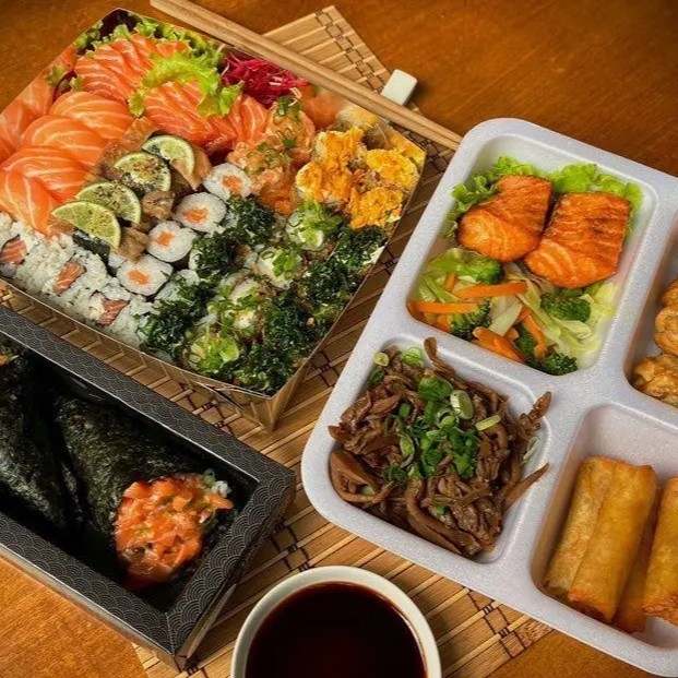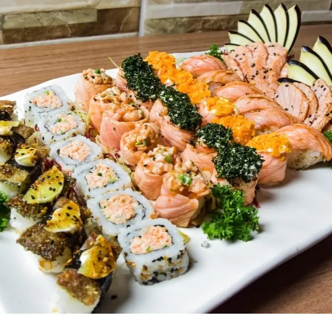 10 Sashimi de tilápia 10 Sashimi de salmão 5 Niguiri de salmão 5 Niguiri Skin 5 Niguiri do chefe 6 Uramaki de salmão 6 Hot-Roll