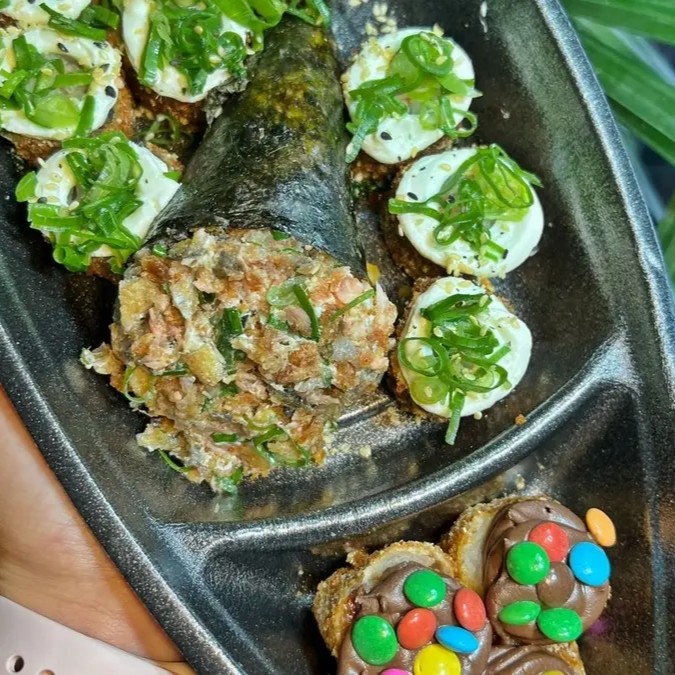 7 unidades de Hot-Roll com cream-cheese e cebolinha 7 unidades de Hot-Roll com cream-cheese e doritos 7 unidades de Hot-Roll com cream-cheese e couve crispy 7 unidades de Hot-Roll com cream-cheese e gergilim 7 unidades de Hot-Roll doce com creme de avelã