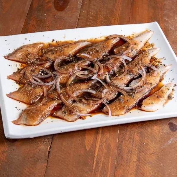Fatias finas de tilápia, com um molho especial do chefe acompanhado de cebola roxa