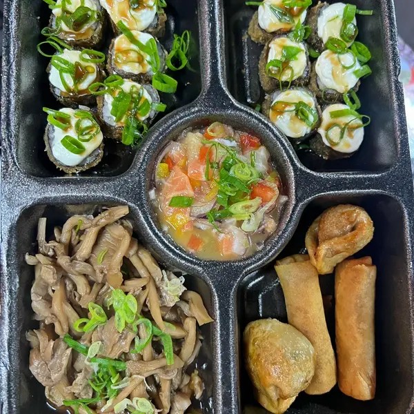 1 Porção de shimeji 1 Porção de Cerviche 2 Harumaki 2 Guioza bovina 12 Hot-Roll