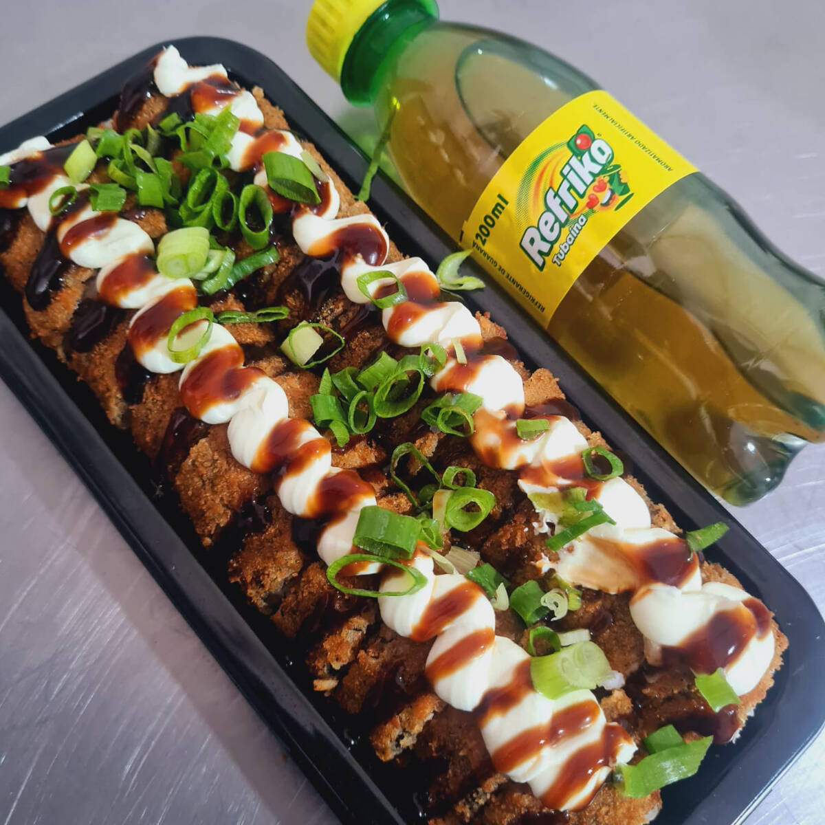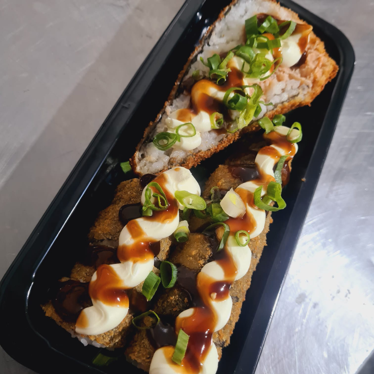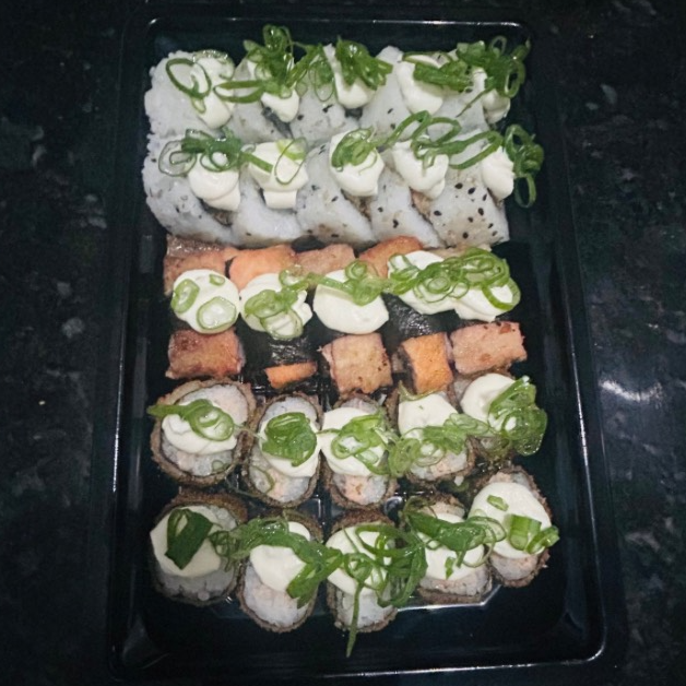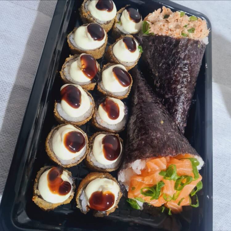 3 ali sushi flambado, 3 uramaki grelhado, 8 hot holls, 2 hot bana com chocolate, 2 niguiri skin, 1 temaki frito de salmao grelhado,