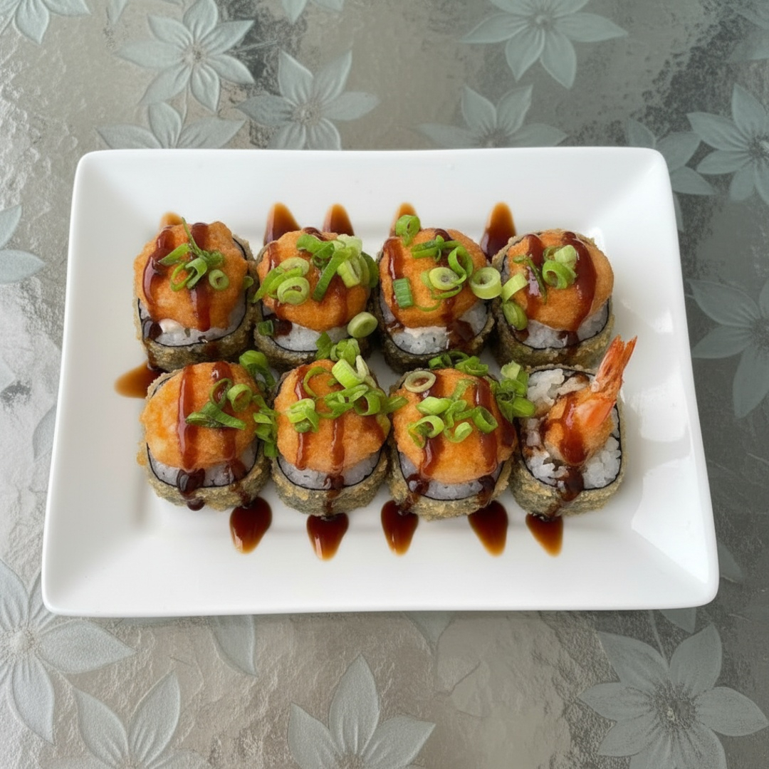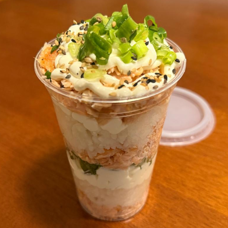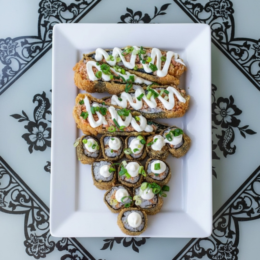 Base de arroz empanado com recheio de salmao cru ou grelhado.