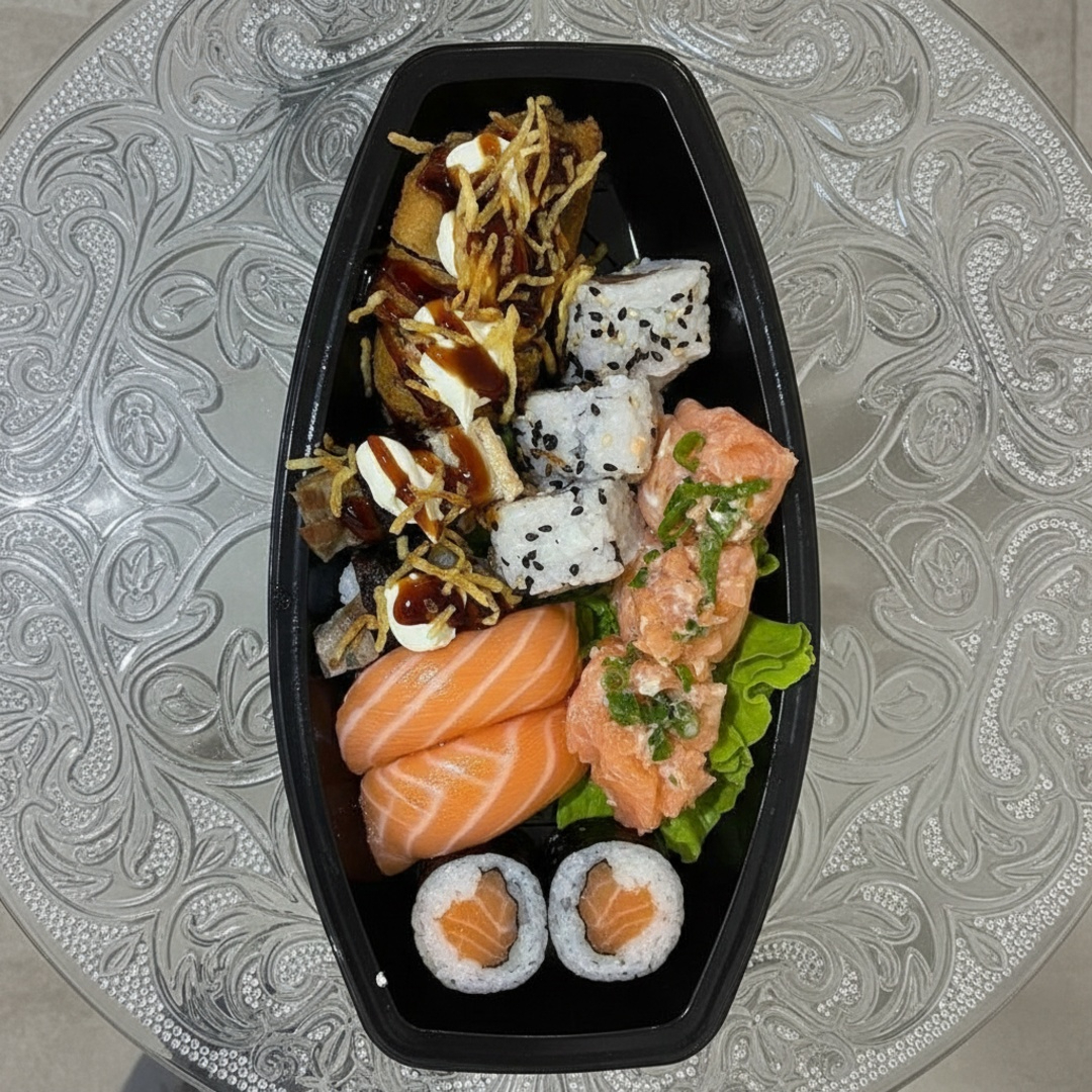 Pratos quentes: 2 rolinho de queijo 2 bolinho de salmao 1 batata frita 1 salmão grelhado 1 yakisoba 1 yakimeshi 1 shimeji. Pratos frios: 6 sashimi variados 2 niguiri 2 sushi jhow 2 hossomaki 2 uramaki 2 hot roll 1 temaki (salmao cru ou salmao grelhado)