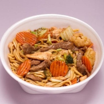 Frango,carne ,macarrâo,mix legumes,molho de soja ,oléo gergelim torrado