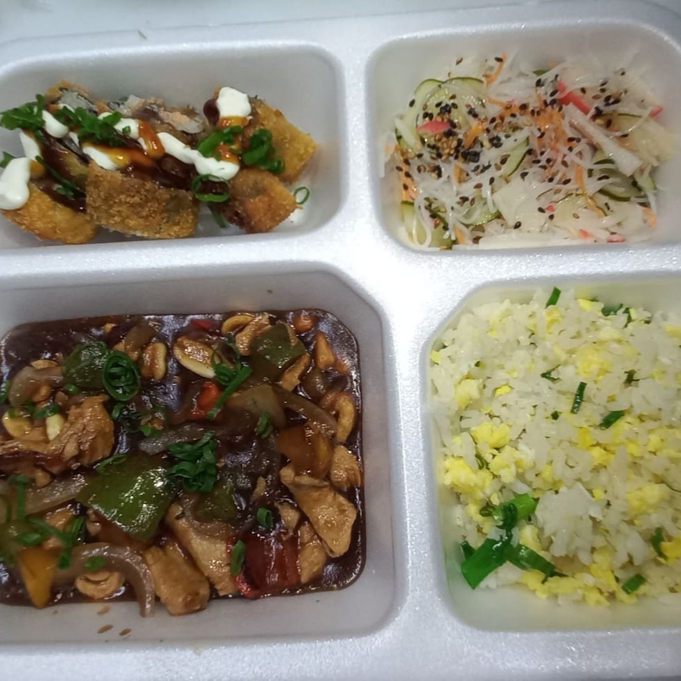 Frango xadrez,gohan, saladinha ,uramaki california
