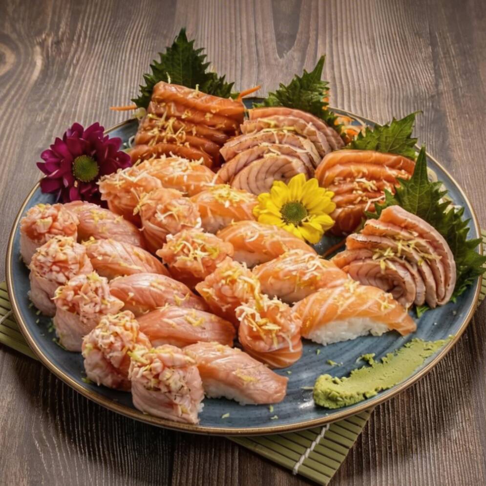 10 sashimis salmão trufado 10 sashimi massaricado 5 niguiri salmão trufado 5 niguiri maçaricado 5 jyo salmão trufado 5 jyo salmão maçaricado Todas as peças contem raspas de limão ciciliano,azeite trufado e flor de sal. Sem alterações!!! Deixe sua avaliação 5 estrelas no sobre esse pedido... Vai nos ajudar bastante ;)