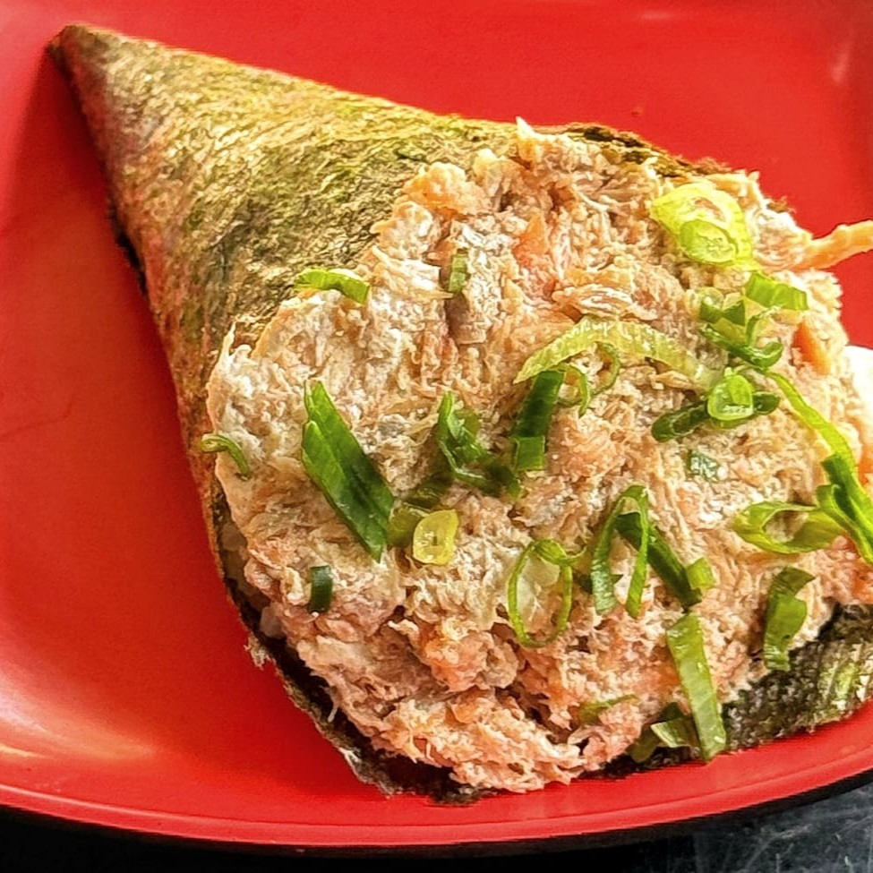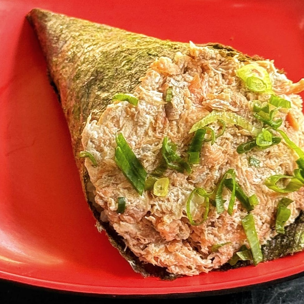 O interior é preenchido com um bolinho de arroz delicadamente preparado, garantindo uma textura macia e saborosa. Adicionamos, ainda, salmão picado, cuidadosamente selecionado, e cebolinha fresca para dar um toque final de sabor.