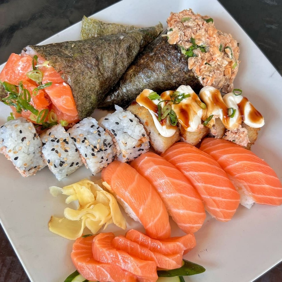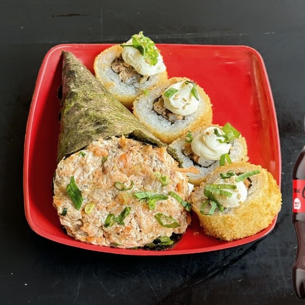 1 Temaki grelhado, 4 Hot Rolls grelhado e 4 bolinhos de salmão grelhados. Acompanha Coca-Cola 350ml com desconto.