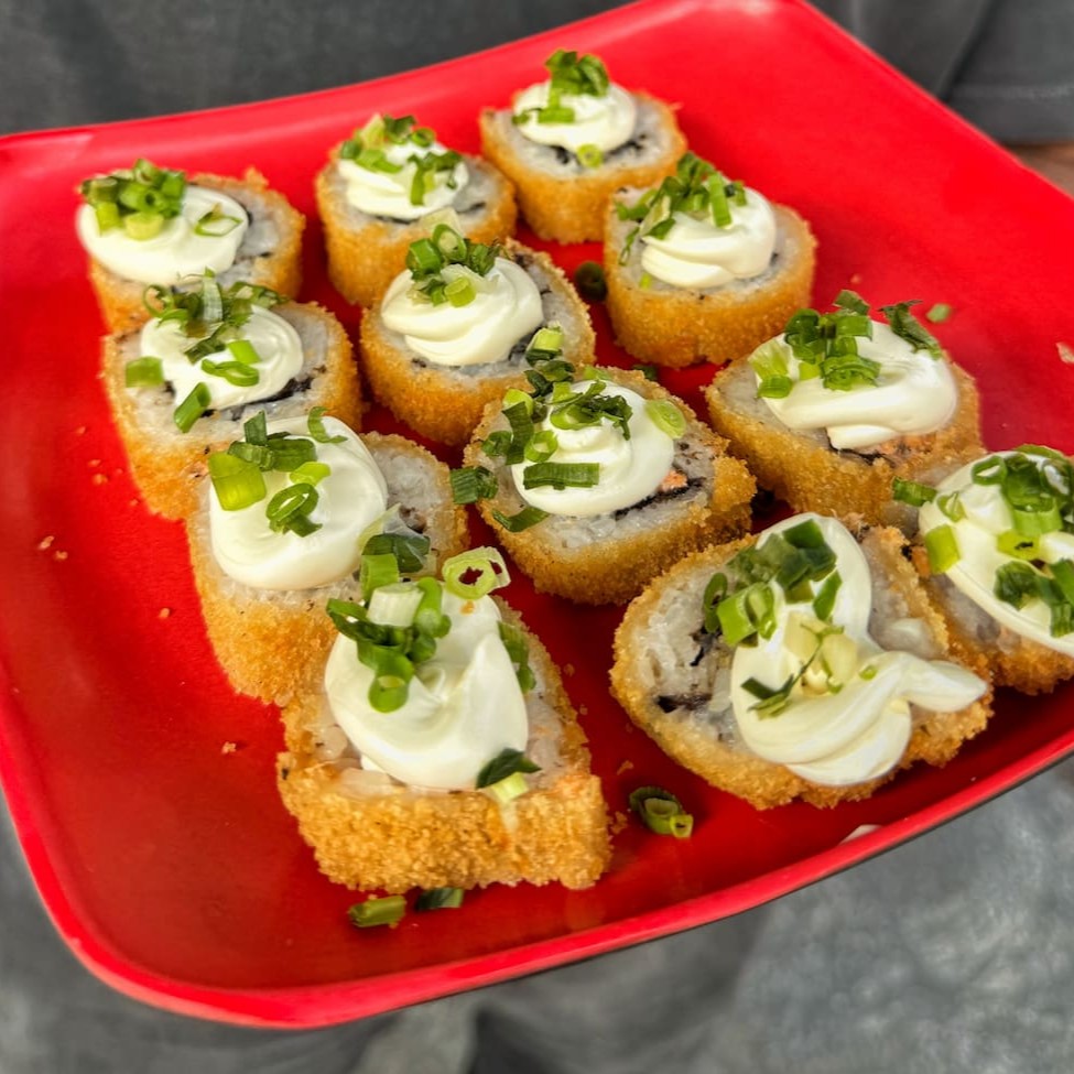 São 20 unidades de Hot Roll tradicional com muito cream cheese, molho tare e finalizado com um toque de cebolinha fresca.