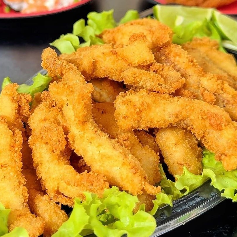 Uma barca recheada com uma Deliciosa porção de peito de frango sem osso em cubos empanado.