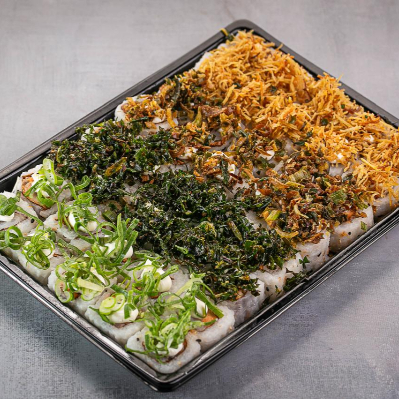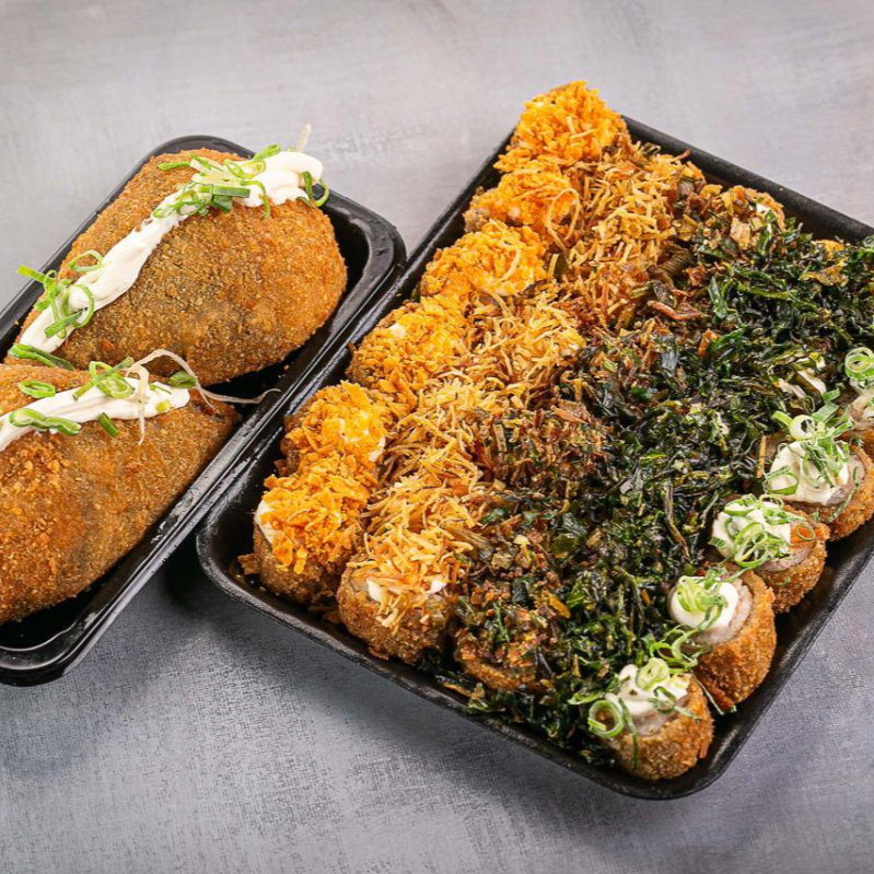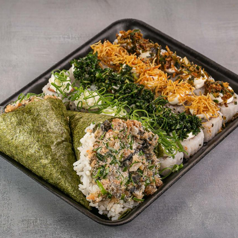 5 uramaki com Doritos, 5 uramaki com couve crispy, 5 uramaki com batata crispy, 5 uramaki com cream cheese e cebolinha