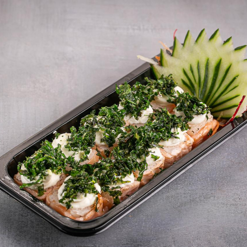 salmão, creme cheese, shari, couve crispy