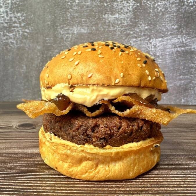 Nosso Onion Crispy Burguer, possui Pão Brioche Vegano, Cebola Crocante, Ketchup, Queijo Mussarela Plant Based, Hamburguer Vegetal (Bacon e Picanha Veg) de 130g!