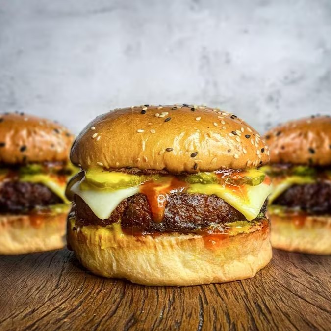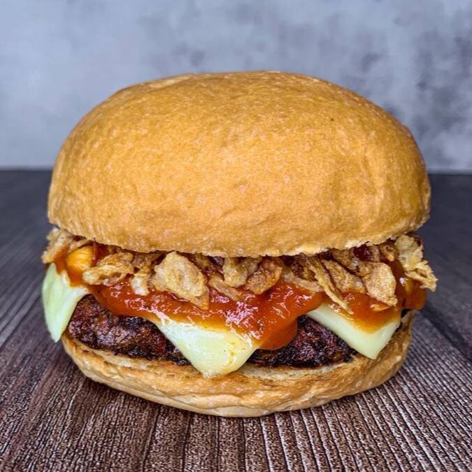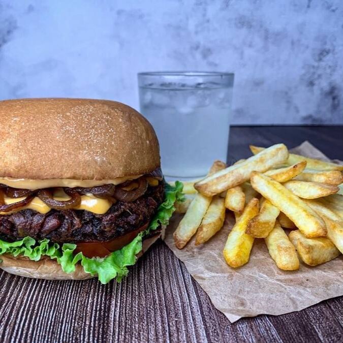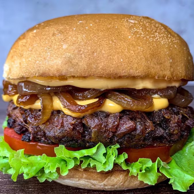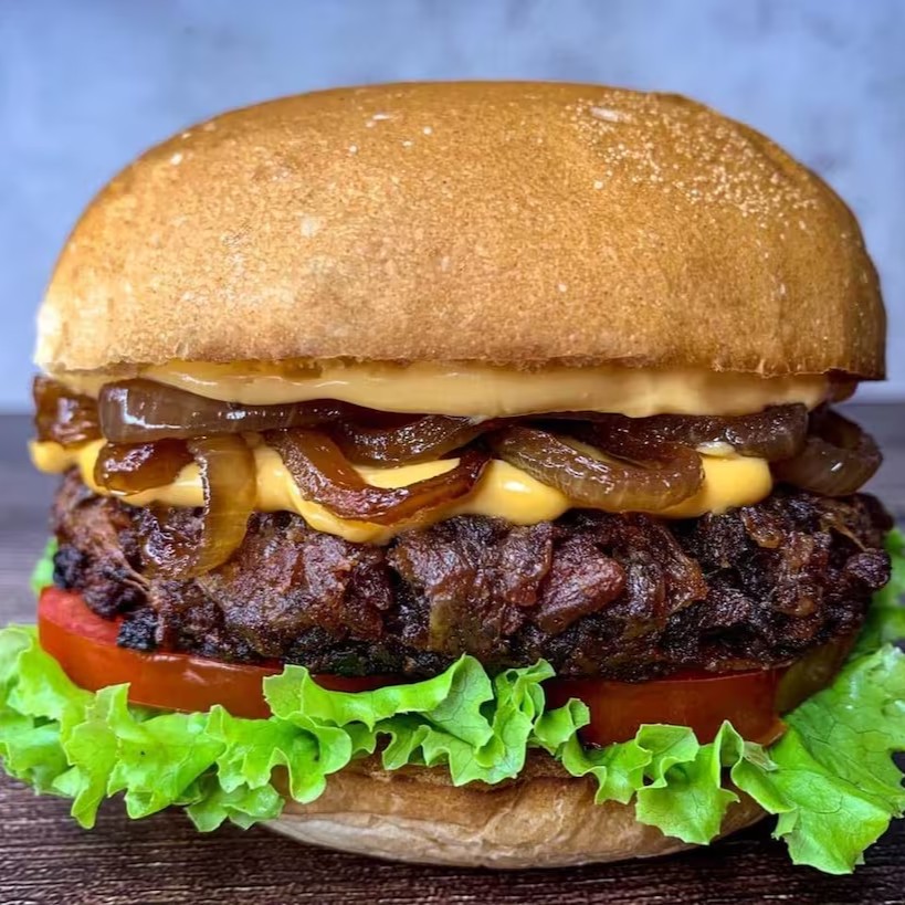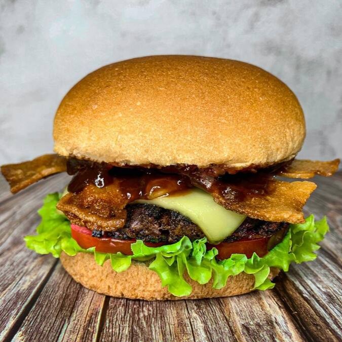 Nosso Cheddar Bacon Burger, é feito com nosso delicioso burger a base de plantas, cheddar cremoso, Fatias de bacon vegano e Cebola caramelizada! Meu Deus, uma delicia!!