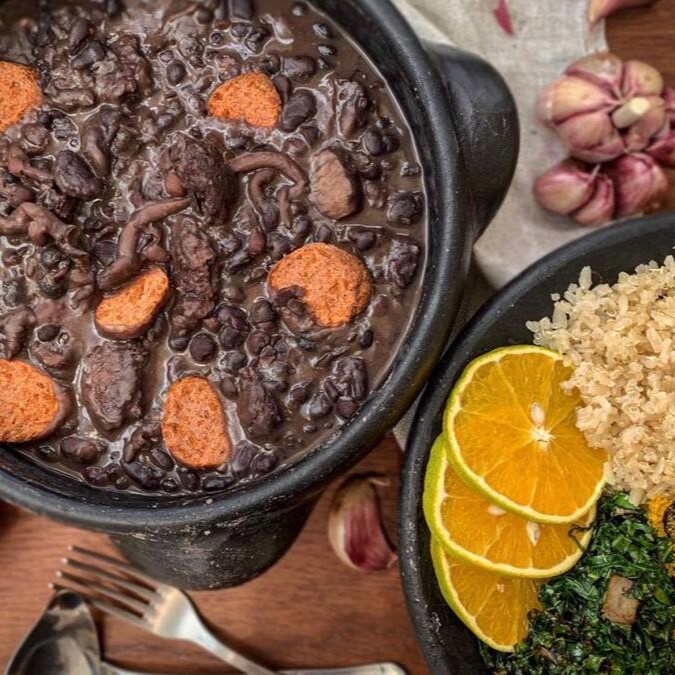 Nossa feijoada é feita com feijão preto, Shimeji, carne de soja, e Linguiça Toscana (vegana), acompanhada com uma deliciosa Farofa de Dendê com Azeitonas, Couve refogada no Alho, e um super Arroz Integral com Quinoa saldável! Não esqueça de escolher um Tempero Abaixo!
