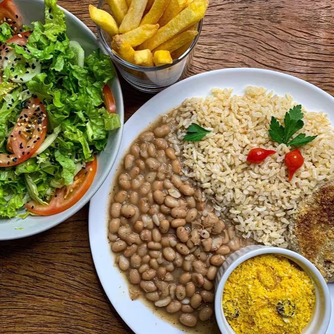 Nosso delicioso Prato Brasileiro do Dia a Dia , Arroz, Feijão carioca, Farofa de dendê com azeitonas Pretas, Bife a Milanesa, Escolha se quiser mais acompanhamentos!