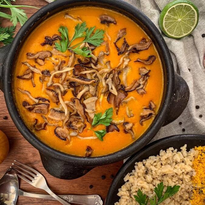 Nosso incrível Bobó de Cogumelos Shimeji, puxado ao Azeite de Dendê com o verdadeiro sabor da Bahia, acompanhado com nosso super saudável Arroz integral com Quinoa e Farofa de Dendê refogada ao alho, cebola e Azeitonas Pretas! Não esqueça de escolher um Tempero Abaixo!