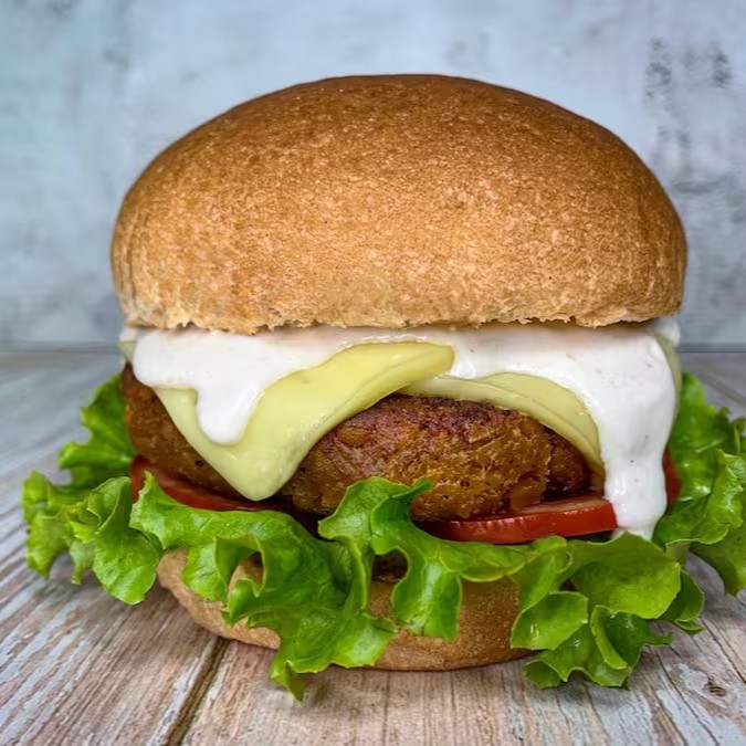 Nosso Hambúrguer de Falafel, é composto por Pão Brioche Vegano, seu Hamburguer de Falafel (Grão de Bico), possui 150g, Queijo Mussarela, Alface, Tomate, e nossa super Maionese de Hamburgueria Caseira!