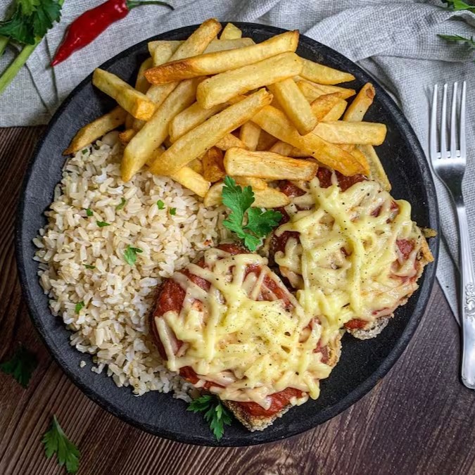 Nosso Filé a Parmegiana, é composto por bife de proteínas vegetais* (ervilha, quinoa e soja), empanado por uma camada de farinha de mandioca, molho de Tomate, e coberto por um delicioso Queijo Mussarela Plant-Based, o Prato acompanha Arroz (escolher Arroz Integral com Quinoa ou arroz Branco) e Fritas!