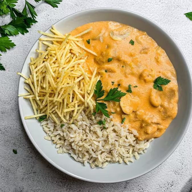 O nosso Strogonoff Vegano Especial, é composto por Arroz (escolher Arroz integral com Quinoa ou Arroz Branco), Batata Palha, e nosso Strogonoff feito de Carne Vegetal, Champions e nosso creme a base de Mandioca e Creme de Leite Vegetal.