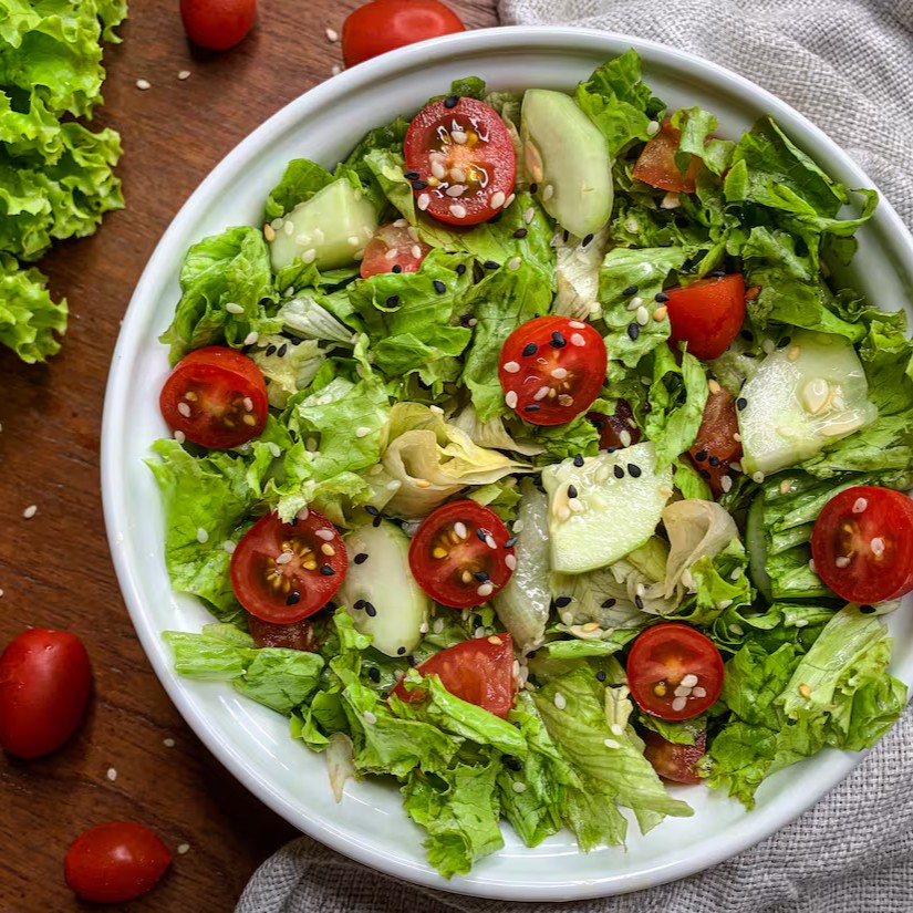 Alface crespa, pepino, tomate italiano, sementes de gergelim preto e branco. Leve, nutritiva e cheia de sabor! *Foto somente ilustrativo*
