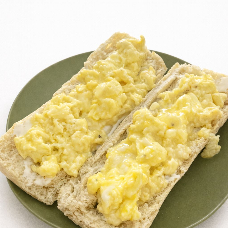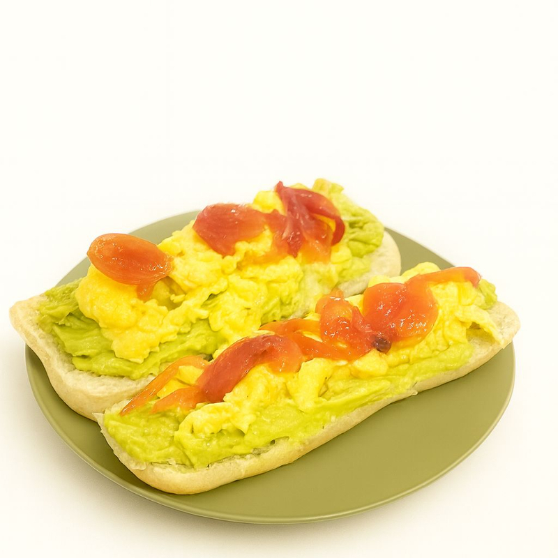 Pão ciabatta, pasta de avocado, ovos mexidos e picles de cebola roxa.
