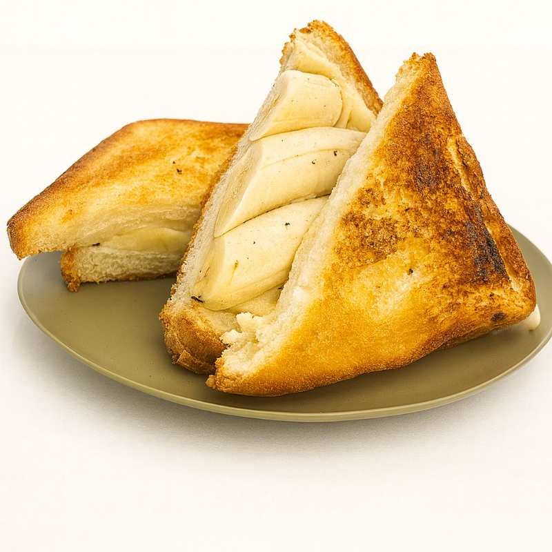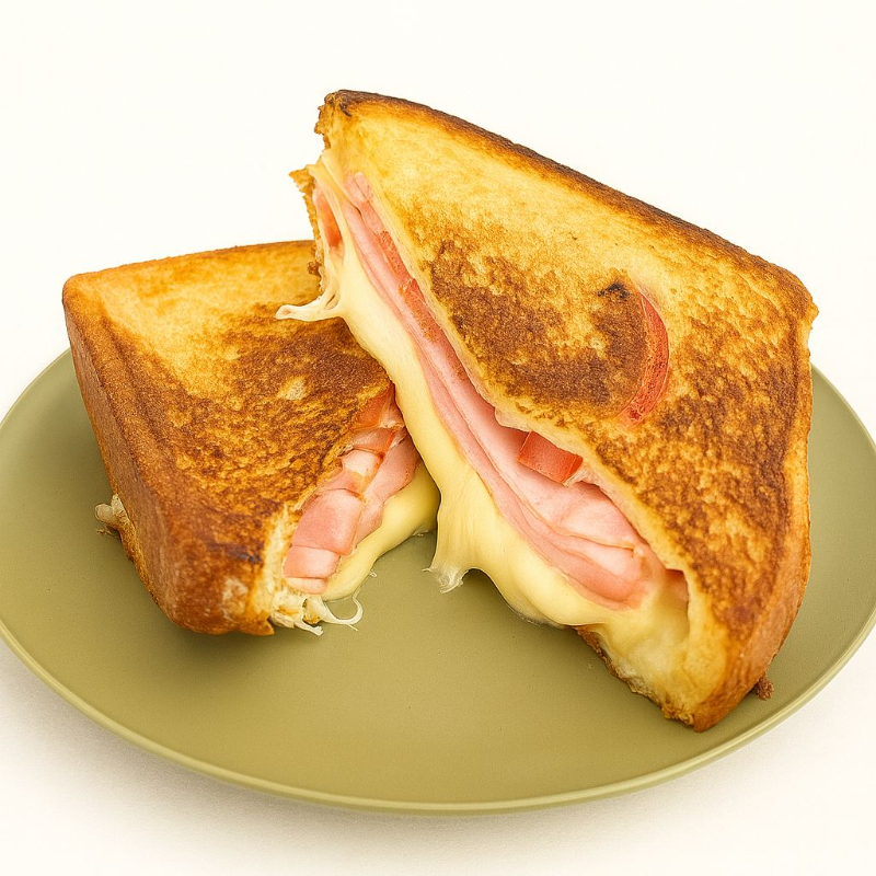 Pão de forma, queijo, presunto, tomate e manjericão.