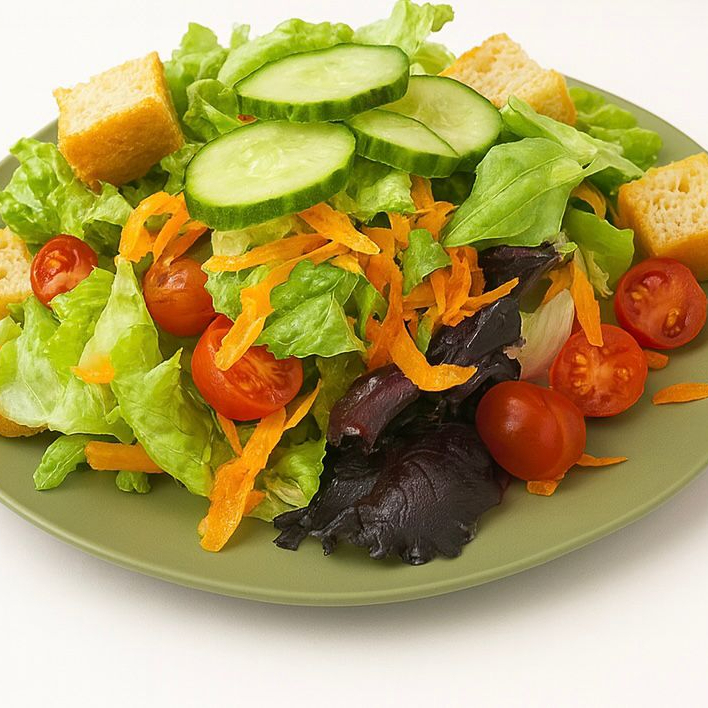 Mix de folhas, cenoura, tomate cereja, picles pepino e molho vinagrete.