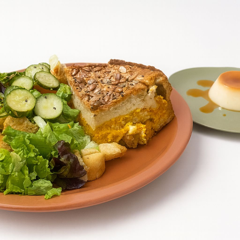 Experimente nosso almoco executivo.Uma fatia de torta,uma salada e um pudim