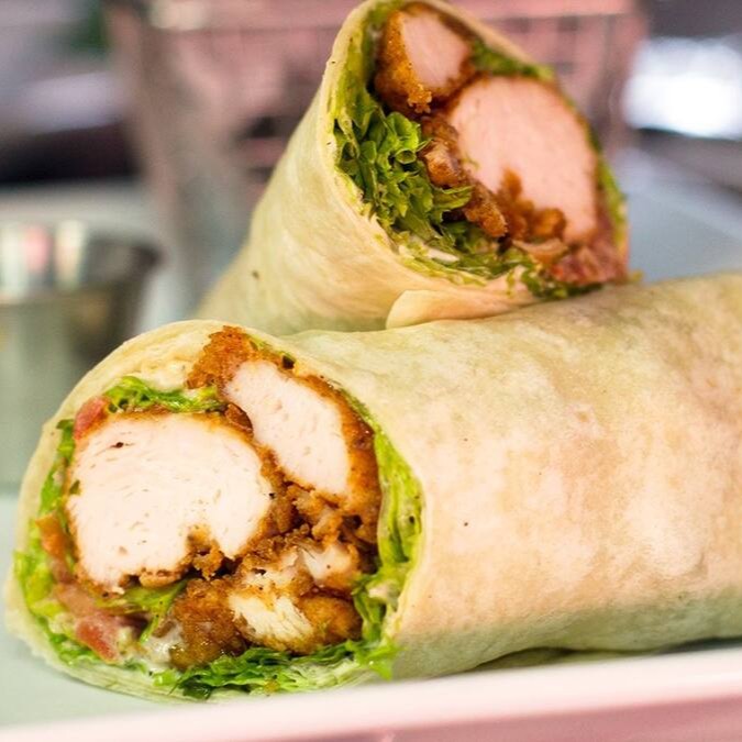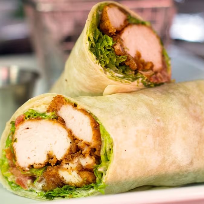 Lanche Frango crocante com tomate, salada de repolho, cenoura, alface e molho de alho no pão sírio