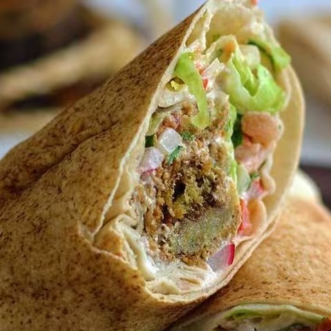 Lanche de falafel com alface, tomate, molho de alho , no pão sírio (para vegano é possível substituir o molho de alho por tahine).