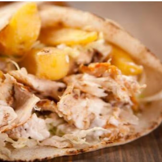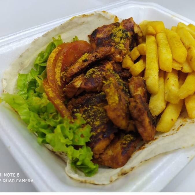 Lanche de farrita de frango temperado . Com pimentão . Batata , e molho de alho, no pão sírio