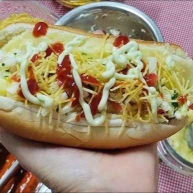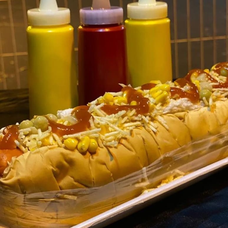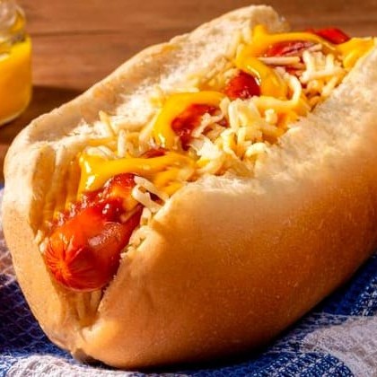 Pão de hot dog fresquinho e macio, salsicha, maionese, molho de tomate artesanal, ketchup, mostarda, milho, vinagrete, batata palha, cheddar ou Catupiry e purê de batatas.