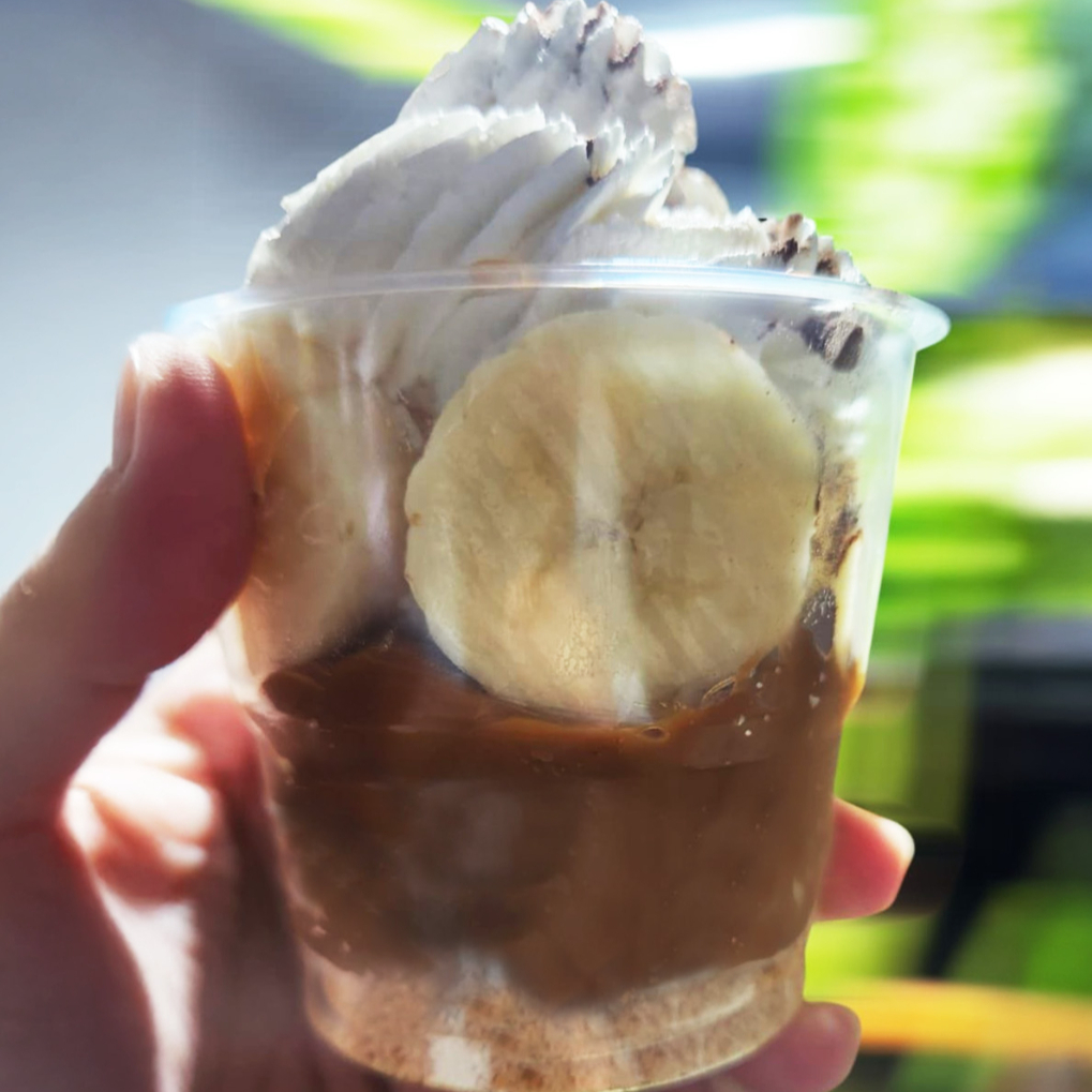 São 4 camadas de puro sabor: primeiro uma camada de farofa crocante de biscoitos, seguida por uma generosa camada do nosso exclusivo doce de leite (aquele na medida perfeita), por cima rodelas de bananas fresquinhas e para finalizar uma cobertura de chantinho polvilhado com cacau! Você Precisa experimentar!