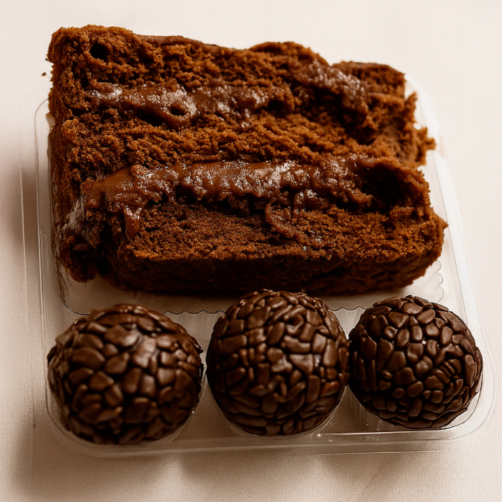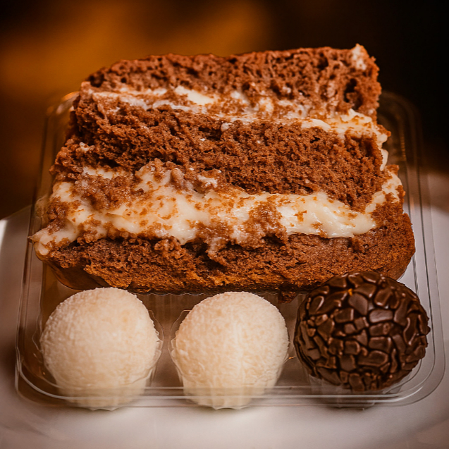 Slice cake de brigadeiro bem chocolatudo: massa fofinha de chocolate, recheio cremoso de brigadeiro e aquele sabor de chocolate que abraça a alma! Ideal pra quem ama uma sobremesa intensa, caprichada e feita com carinho. Uma explosão de brigadeiro em cada mordida Serve 1 pessoa