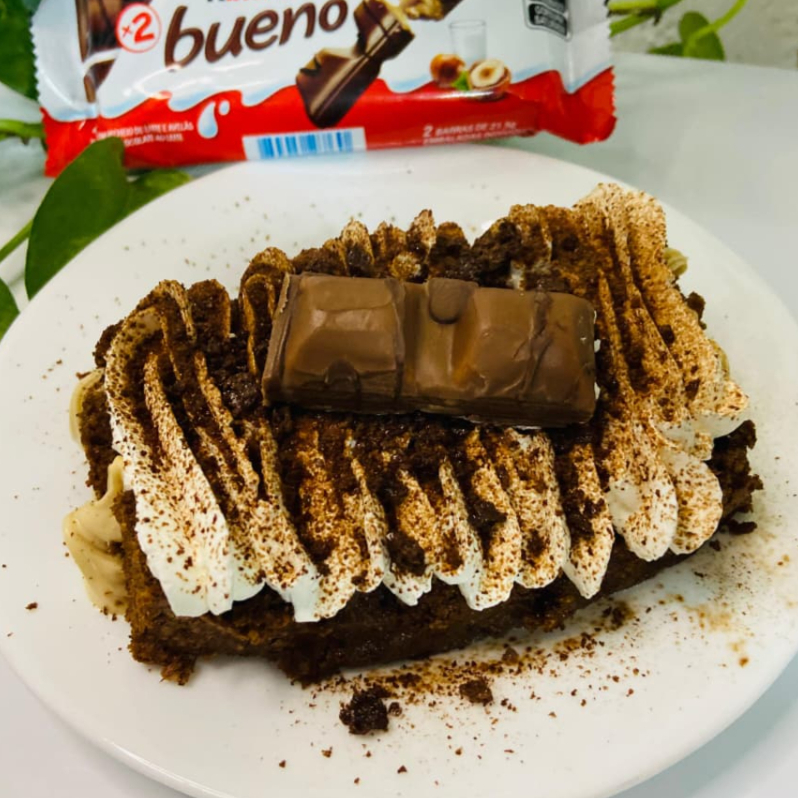 Massa fofinha de chocolate ao leite, com recheio cremoso de creme Bueno que derrete na boca. Finalizado com chantilly leve, polvilhado com Ovomaltine crocante e coroado com um pedaço de Kinder Bueno.