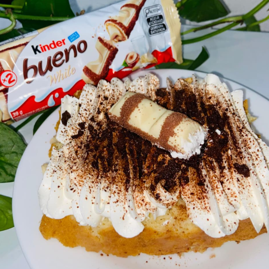 Massa fofinha de baunilha, com recheio cremoso de creme Bueno que derrete na boca. Finalizado com chantilly leve, polvilhado com Ovomaltine crocante e coroado com um pedaço de Kinder Bueno White.