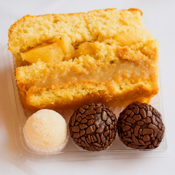 Slice cake de doce de leite com abacaxi: fofinho, molhadinho e cheio de pedacinhos de fruta! Acompanha 3 docinhos à sua escolha pra deixar seu momento ainda mais gostoso. Uma caixinha de carinho em forma de sobremesa - Serve 1 pessoa