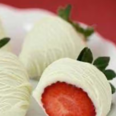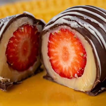 Chegooou, um morango inteiro, envolto em um creme especial, e coberto com chocolate o leite e riscado com chocolate branco......é uuumaaa delicia, ele não é congelado, mas segue a mesma linha de uma Paleta