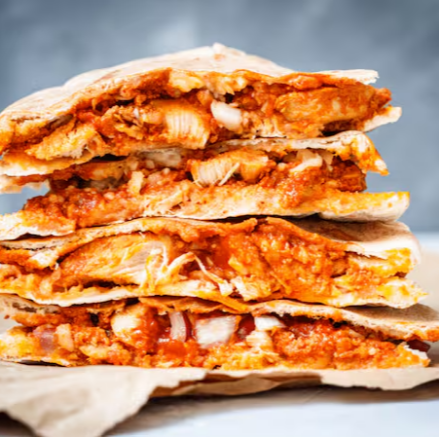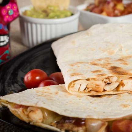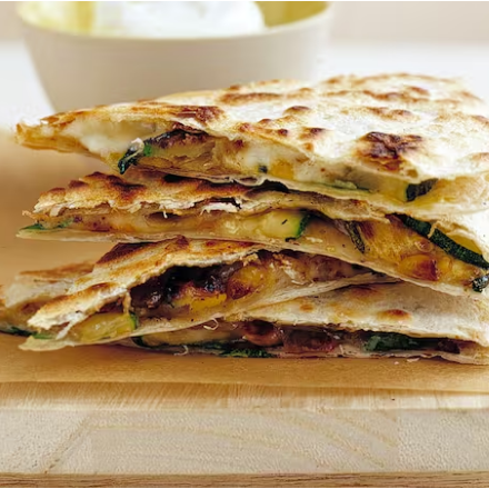 Tortilla de trigo, fininha e crocante, tostada rápidamente na chapa. Montada com queijo prato, queijo cheddar, salsa Mexicana, guacamole e sour cream. Serve 1 pessoa